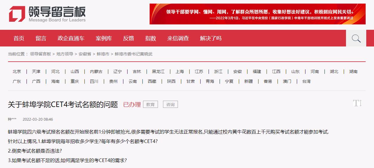 3月20日,有網(wǎng)民在人民網(wǎng)“領(lǐng)導(dǎo)留言板”向蚌埠市委書記留言稱,蚌埠學(xué)院四六級考試報名名額在開始報名前1分鐘即被搶光,很多需要考試的學(xué)生無法正常報名,只能通過校內(nèi)黃?;〝?shù)百上千元購買考試名額才能參加考試。請問蚌埠學(xué)院每年招收多少學(xué)生?每年有多少個名額考CET4?倒賣考試名額是否違法?如果考試名額不足,如何滿足學(xué)生的考CET4的需求?