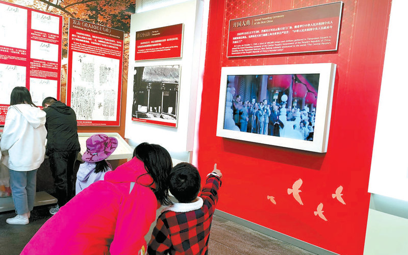 展覽當(dāng)中的一段開國大典的影像資料讓游客們紛紛駐足。“中華人民共和國中央人民政府今天成立了!”聽到錄音里毛主席的這段莊嚴(yán)宣告,游客們不由地挺直了腰桿。
