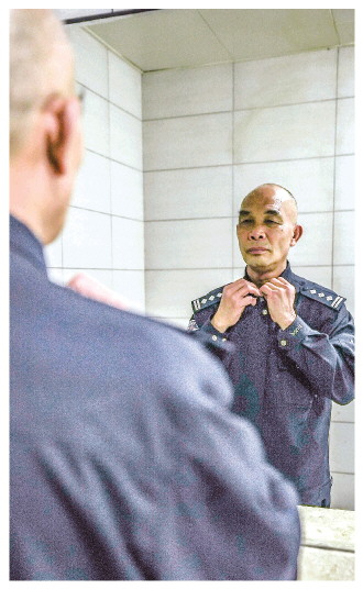 圖③ 鄭國慶對著鏡子認真地整理自己的著裝,最后一天在崗,警容風紀不能亂。