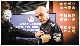圖② 同事為鄭國慶卸下陪伴了他半生的警號,意味著他的職業(yè)生涯正式結束了。