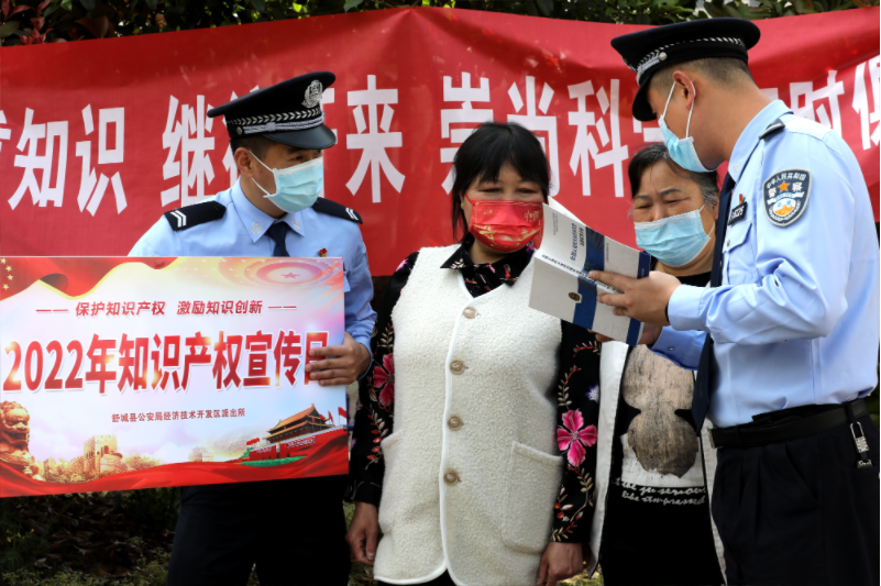 4月20日是全國知識產(chǎn)權(quán)宣傳周首日,安徽省舒城縣公安局經(jīng)濟(jì)技術(shù)開發(fā)區(qū)派出所民輔警來到轄區(qū)北隅村,采取懸掛橫幅、發(fā)放宣傳資料、以案釋法等方式,向村民耐心講解涉知識產(chǎn)權(quán)領(lǐng)域相關(guān)法律知識。圖為派出所民輔警向村民宣傳知識產(chǎn)權(quán)相關(guān)法律規(guī)定。