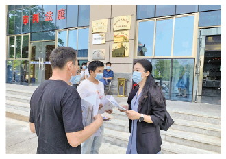 圖為丁明(右)在開庭前再次告知受援人注意事項。 王慧 攝
