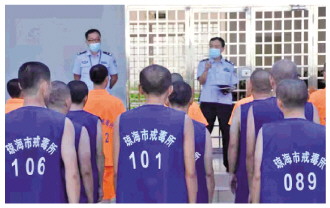 圖為蔡小勇(右)在給戒毒人員上集體教育課。 瓊海市強(qiáng)制隔離戒毒所供圖