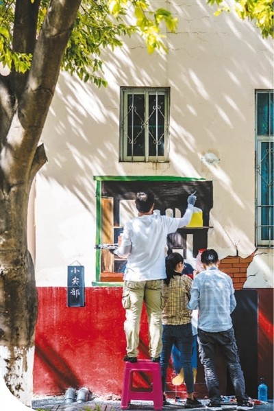 4月28日,云南省玉溪市峨山彝族自治縣桂峰小區(qū),人們?cè)诶吓f小區(qū)的墻面上繪制墻畫。新華社記者 胡超攝