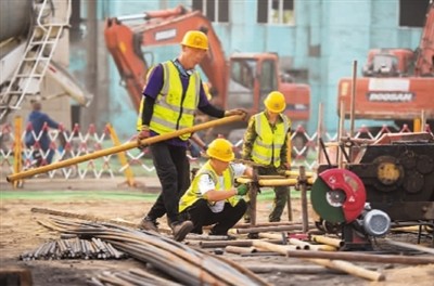 6月24日,內(nèi)蒙古自治區(qū)包頭市友誼十九小區(qū)改造現(xiàn)場(chǎng),工人們?cè)诠さ厣厦β?。新華社記者 彭源攝