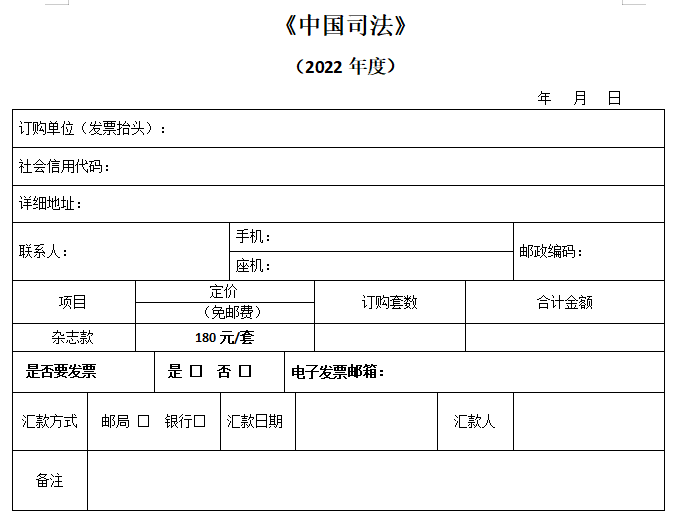 單位匯款時(shí)請(qǐng)務(wù)必標(biāo)明“中國司法+訂購套數(shù)”,個(gè)人匯款請(qǐng)務(wù)必注明“單位名稱+中國司法”。