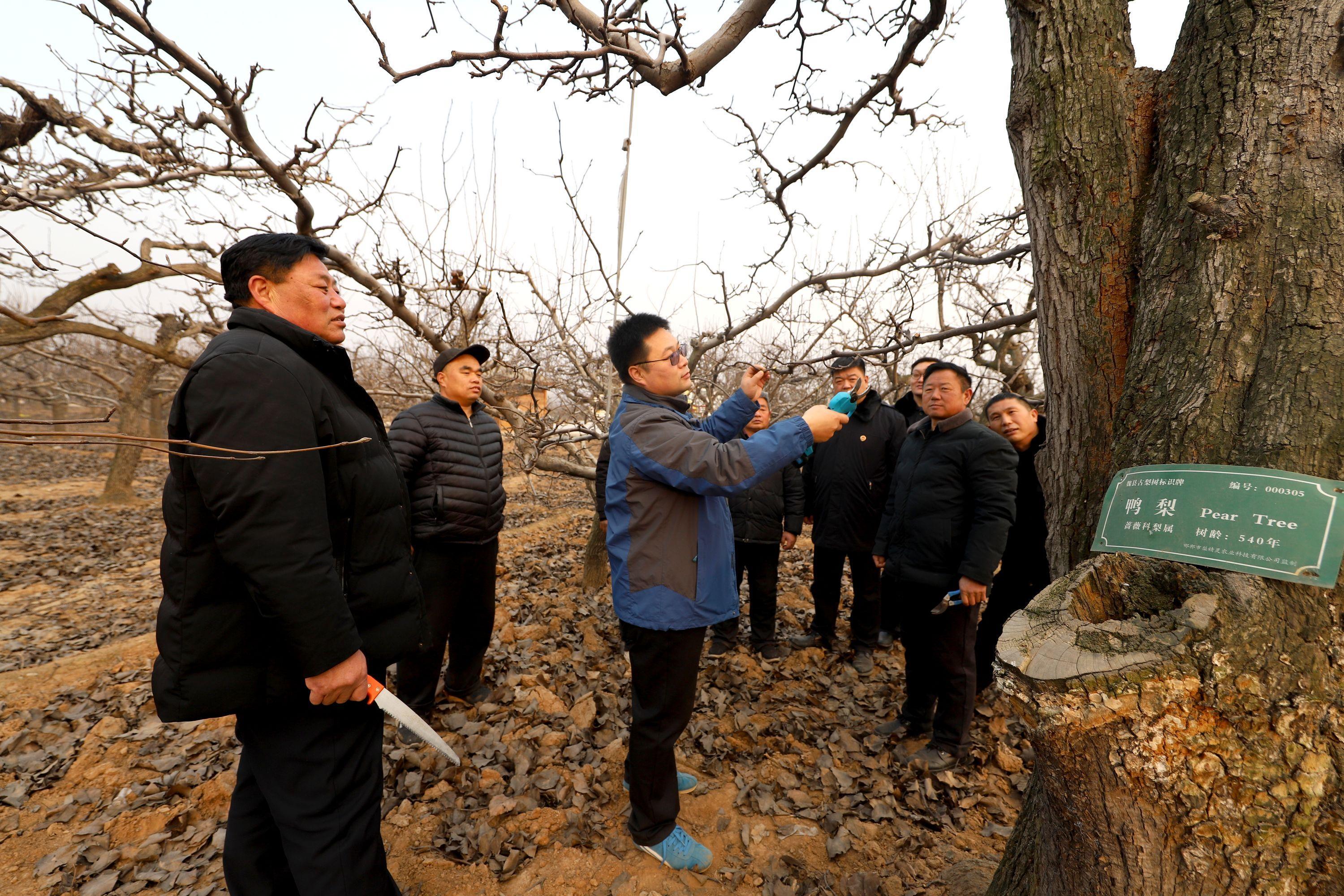 1月4日,河北省魏縣人民檢察院公益訴訟檢察官邀請(qǐng)?jiān)摽h林果服務(wù)中心果樹(shù)專家來(lái)到東南溫村梨園,指導(dǎo)梨農(nóng)對(duì)古梨樹(shù)進(jìn)行冬季剪枝整枝管理,為明年古梨樹(shù)豐產(chǎn)、梨農(nóng)增收做好準(zhǔn)備。圖為專家向梨農(nóng)講解古梨樹(shù)的修剪要求和技巧。