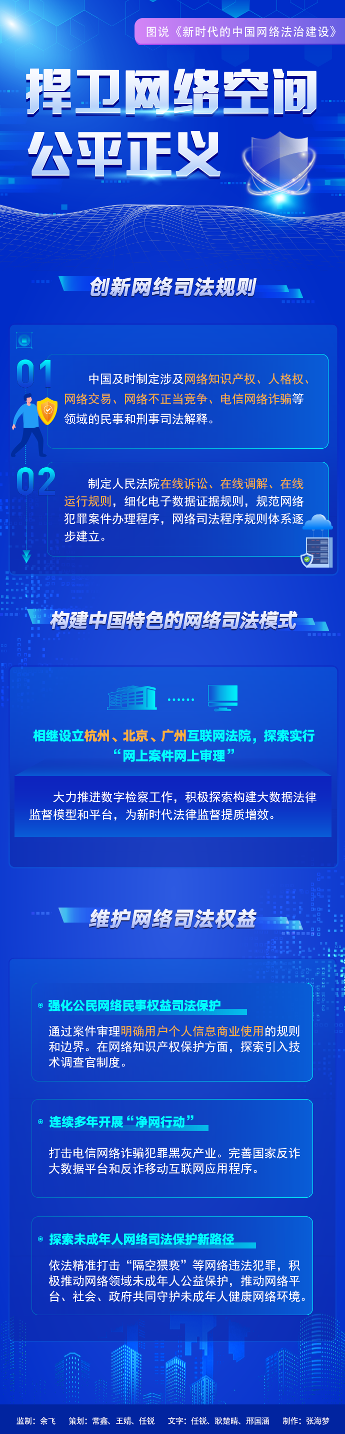 互聯(lián)網(wǎng)是人類文明發(fā)展的重要成果,法治是互聯(lián)網(wǎng)治理的基本方式。長期以來,我國堅持依法治網(wǎng),持續(xù)推進網(wǎng)絡(luò)空間法治化,推動互聯(lián)網(wǎng)在法治軌道上健康運行。3月16日,國務(wù)院新聞辦公室發(fā)布《新時代的中國網(wǎng)絡(luò)法治建設(shè)》白皮書,讓我們一起來看如何捍衛(wèi)網(wǎng)絡(luò)空間公平正義。