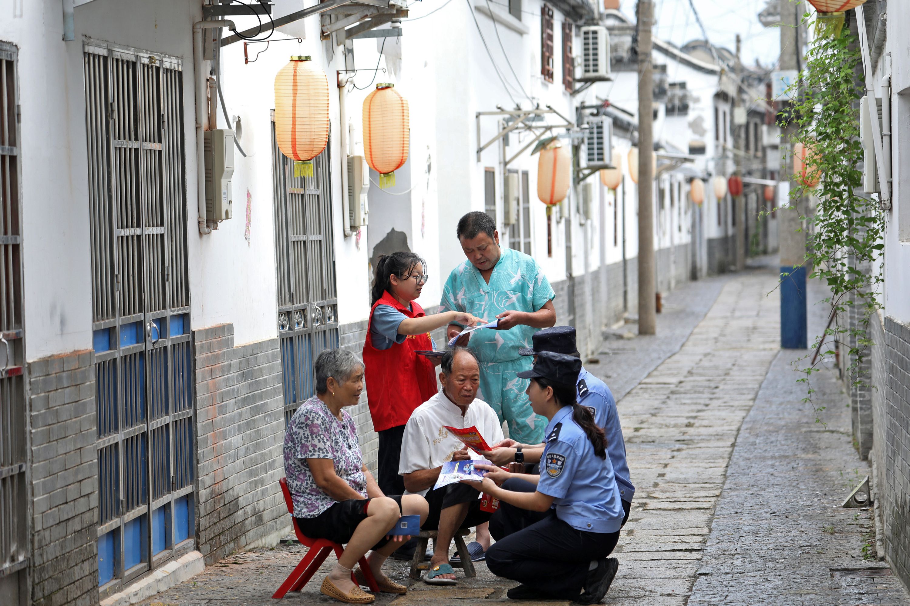 8月16日,江蘇省寶應(yīng)縣公安局射陽湖派出所以開展“夏季治安打擊整治行動”為契機(jī),組織民警與網(wǎng)格員走老街串小巷,向群眾宣講各類防范詐騙的常識,同時(shí)加強(qiáng)日常巡邏和矛盾糾紛排查調(diào)解,確保轄區(qū)老街安全。圖為民警和網(wǎng)格員向老年人宣傳防范養(yǎng)老詐騙知識。
