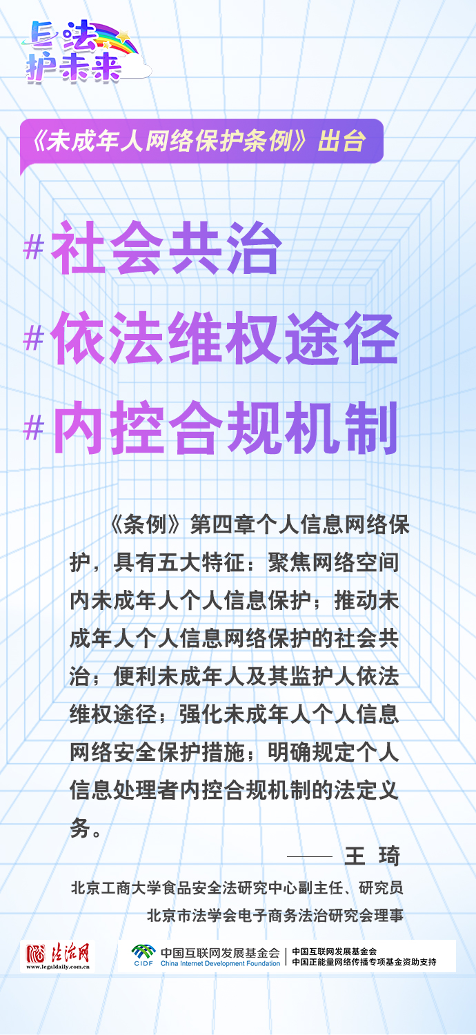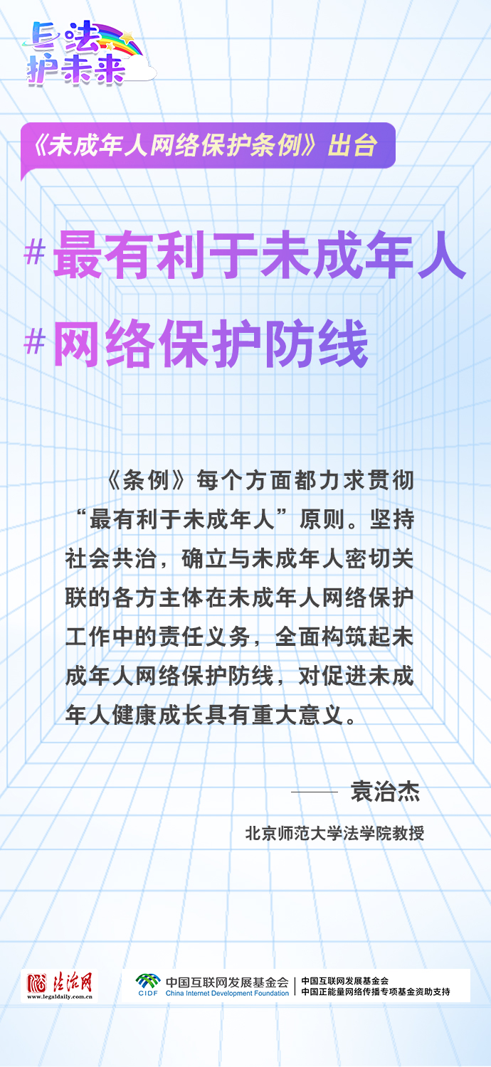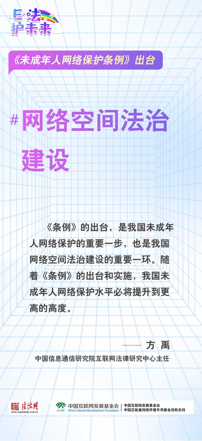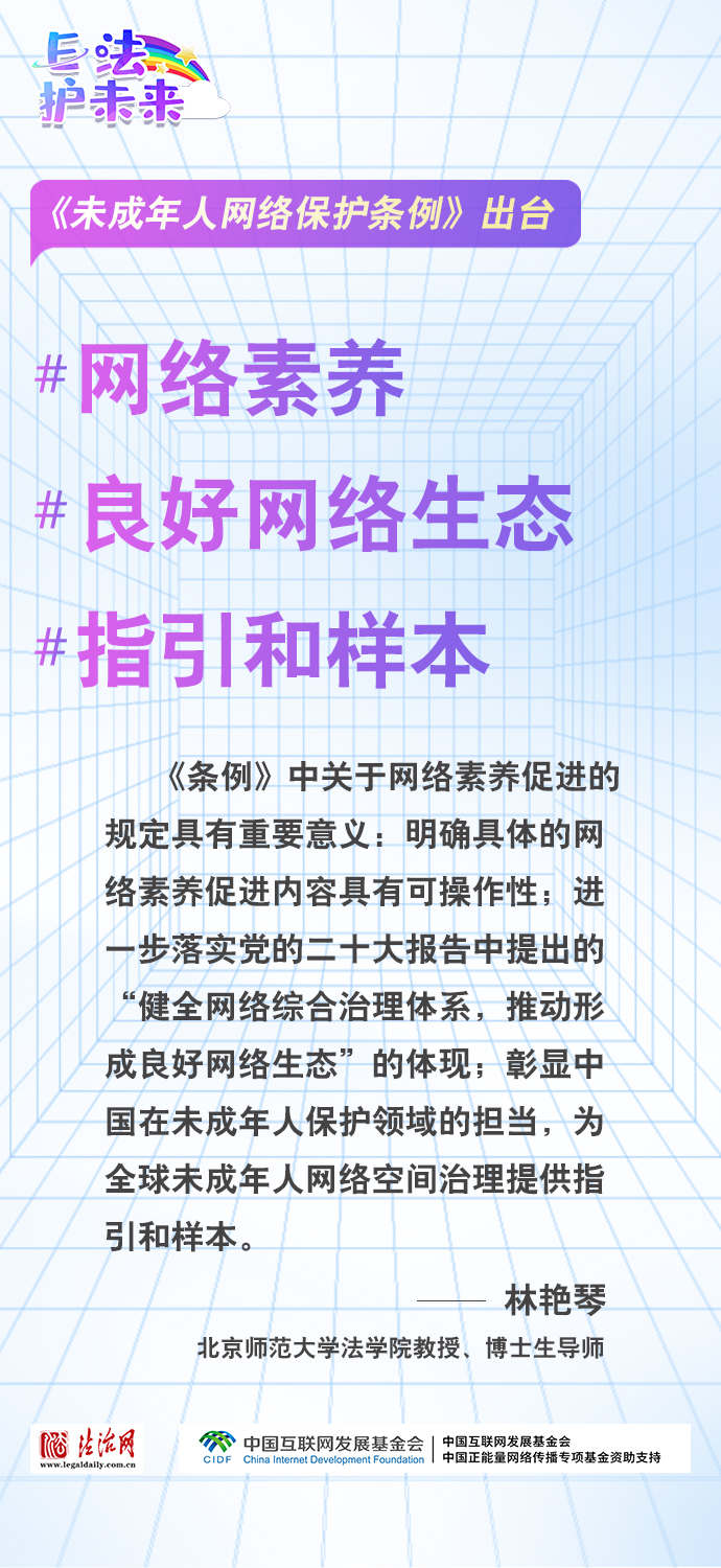 法治網(wǎng)特推出一組“專家有言”海報(bào),內(nèi)容涵蓋《條例》出臺(tái)的現(xiàn)實(shí)意義和時(shí)代價(jià)值、網(wǎng)絡(luò)素養(yǎng)促進(jìn)、網(wǎng)絡(luò)信息內(nèi)容規(guī)范、個(gè)人信息網(wǎng)絡(luò)保護(hù)、網(wǎng)絡(luò)沉迷防治等,充分展現(xiàn)《條例》的出臺(tái)是我國互聯(lián)網(wǎng)治理領(lǐng)域的法治成果,彰顯中國在未成年人網(wǎng)絡(luò)保護(hù)領(lǐng)域的擔(dān)當(dāng),為全球未成年人網(wǎng)絡(luò)空間治理提供指引和樣本。