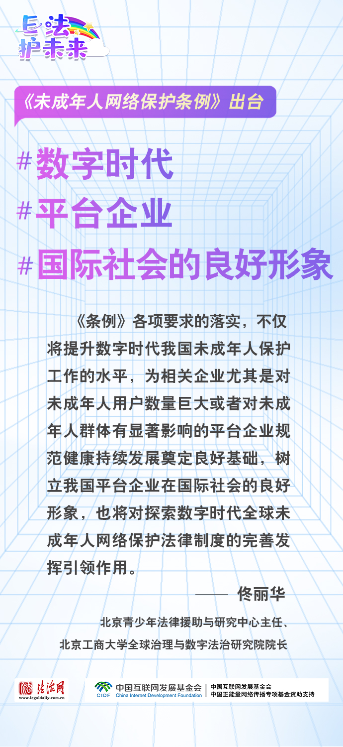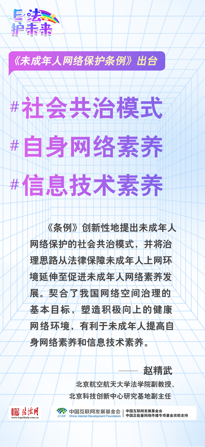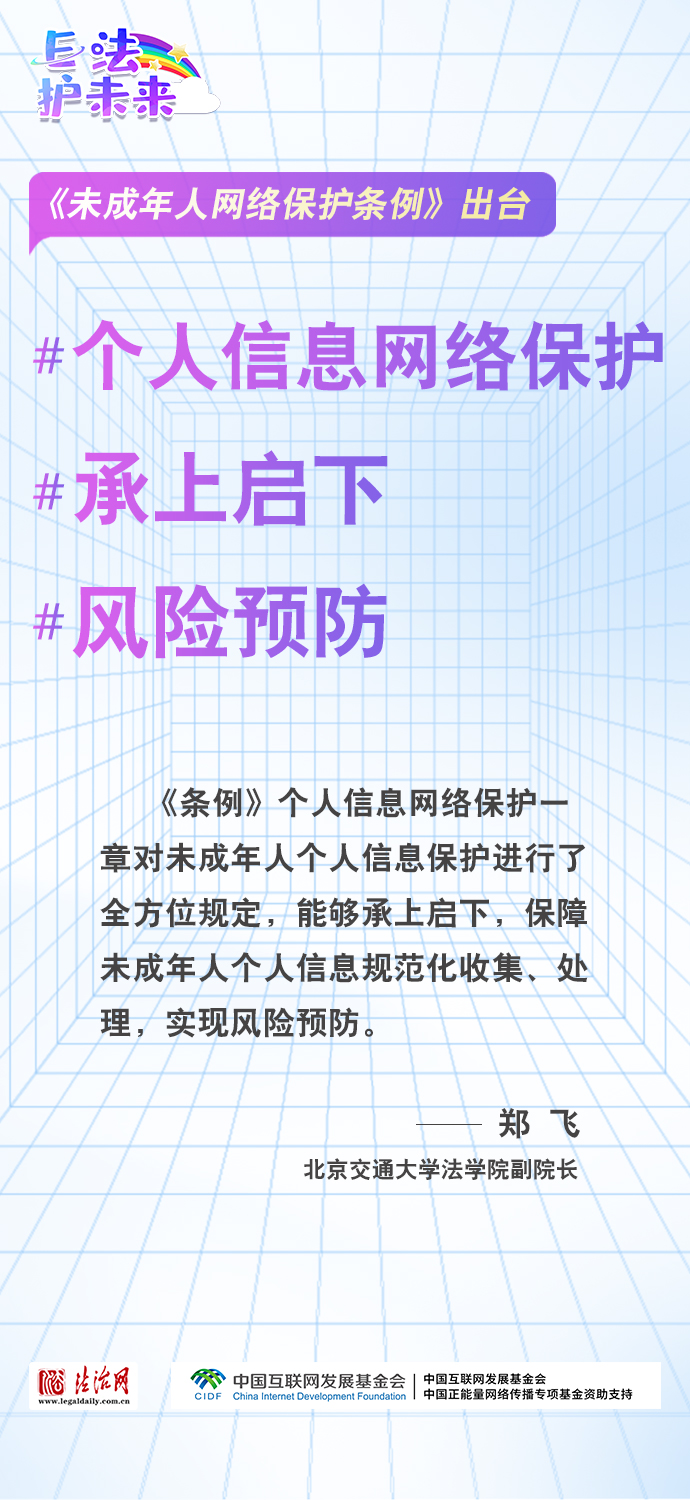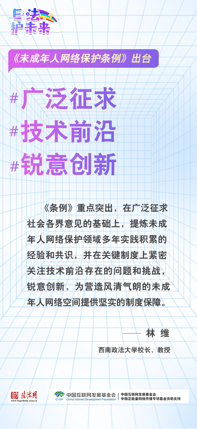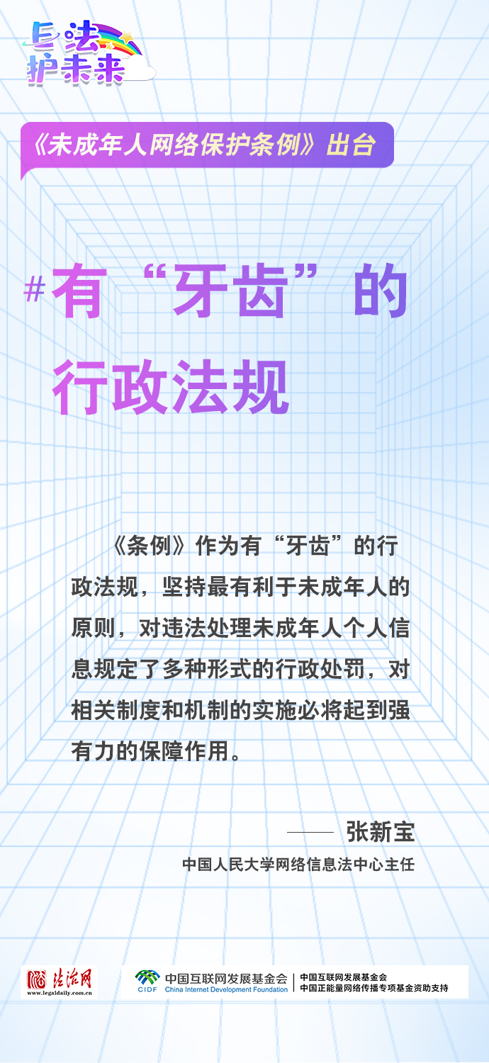 法治網(wǎng)特推出一組“專家有言”海報(bào),內(nèi)容涵蓋《條例》出臺(tái)的現(xiàn)實(shí)意義和時(shí)代價(jià)值、網(wǎng)絡(luò)素養(yǎng)促進(jìn)、網(wǎng)絡(luò)信息內(nèi)容規(guī)范、個(gè)人信息網(wǎng)絡(luò)保護(hù)、網(wǎng)絡(luò)沉迷防治等,充分展現(xiàn)《條例》的出臺(tái)是我國互聯(lián)網(wǎng)治理領(lǐng)域的法治成果,彰顯中國在未成年人網(wǎng)絡(luò)保護(hù)領(lǐng)域的擔(dān)當(dāng),為全球未成年人網(wǎng)絡(luò)空間治理提供指引和樣本。