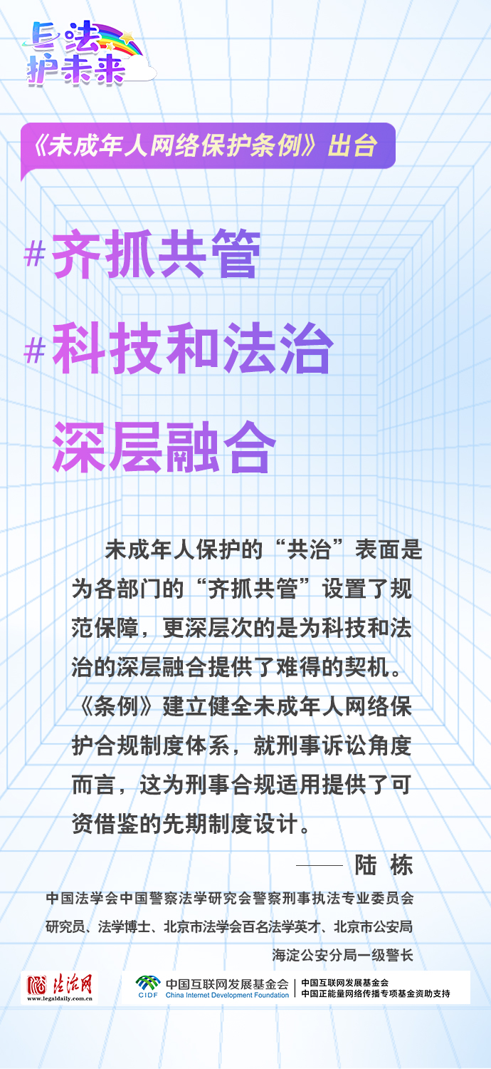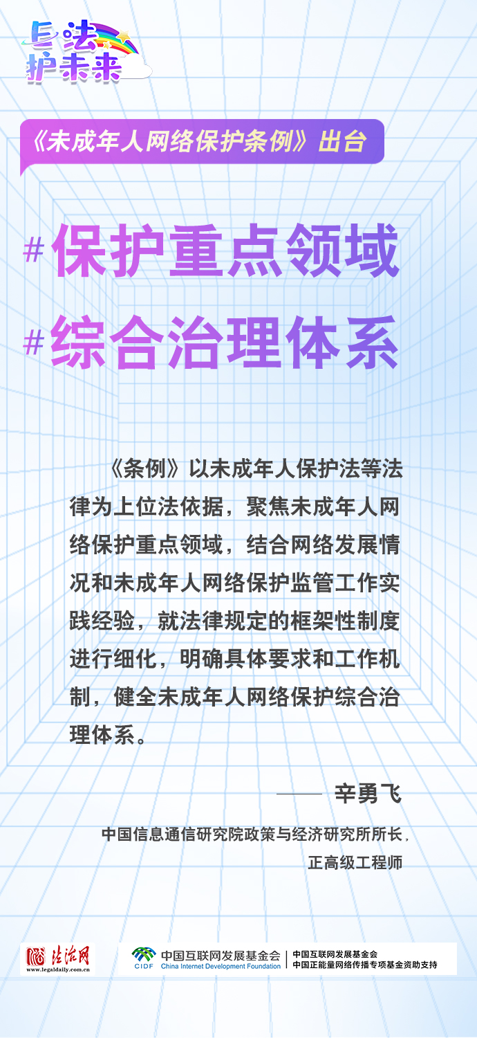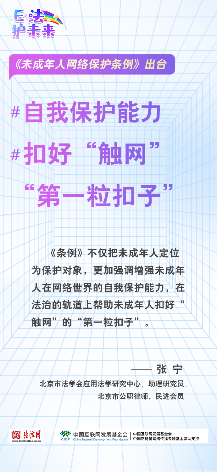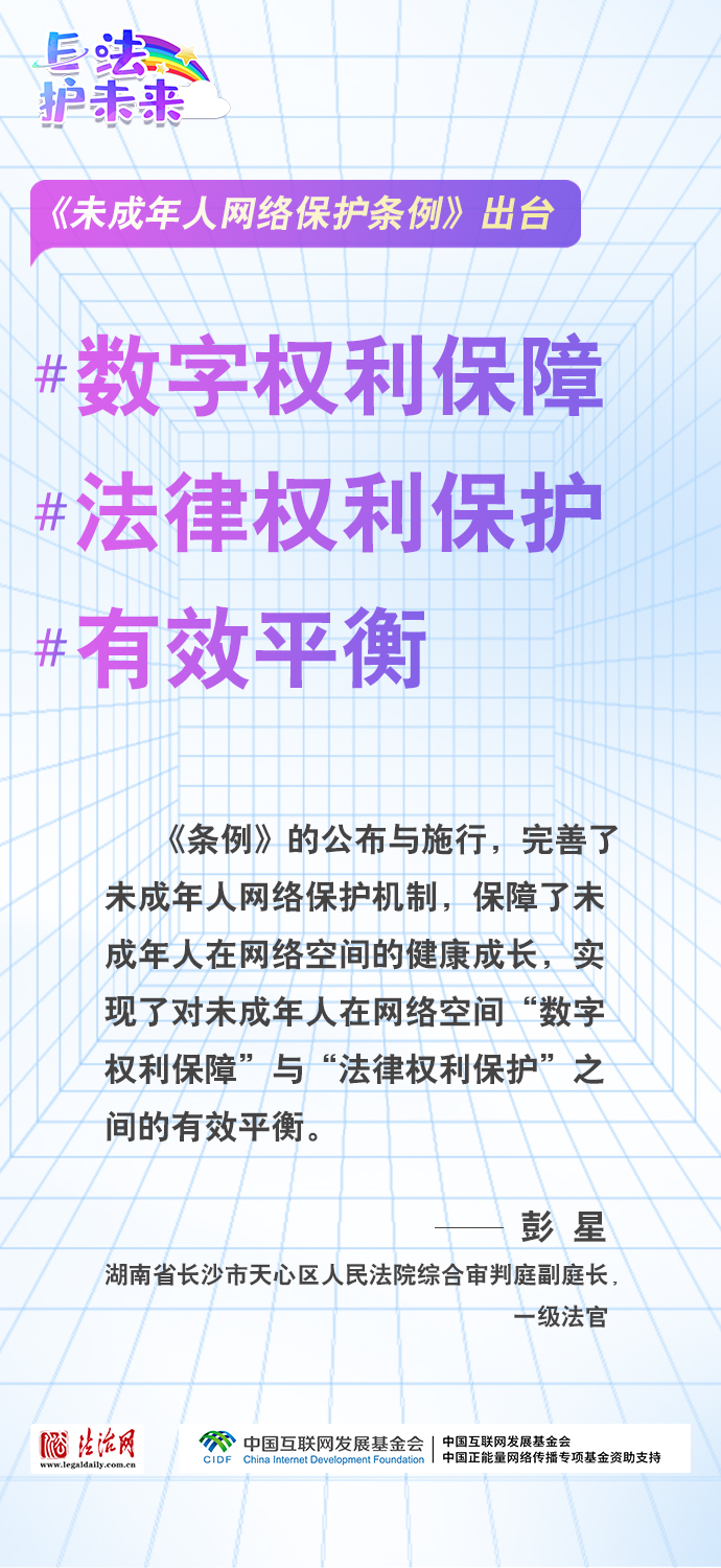 法治網(wǎng)特推出一組“專家有言”海報(bào),內(nèi)容涵蓋《條例》出臺(tái)的現(xiàn)實(shí)意義和時(shí)代價(jià)值、網(wǎng)絡(luò)素養(yǎng)促進(jìn)、網(wǎng)絡(luò)信息內(nèi)容規(guī)范、個(gè)人信息網(wǎng)絡(luò)保護(hù)、網(wǎng)絡(luò)沉迷防治等,充分展現(xiàn)《條例》的出臺(tái)是我國互聯(lián)網(wǎng)治理領(lǐng)域的法治成果,彰顯中國在未成年人網(wǎng)絡(luò)保護(hù)領(lǐng)域的擔(dān)當(dāng),為全球未成年人網(wǎng)絡(luò)空間治理提供指引和樣本。