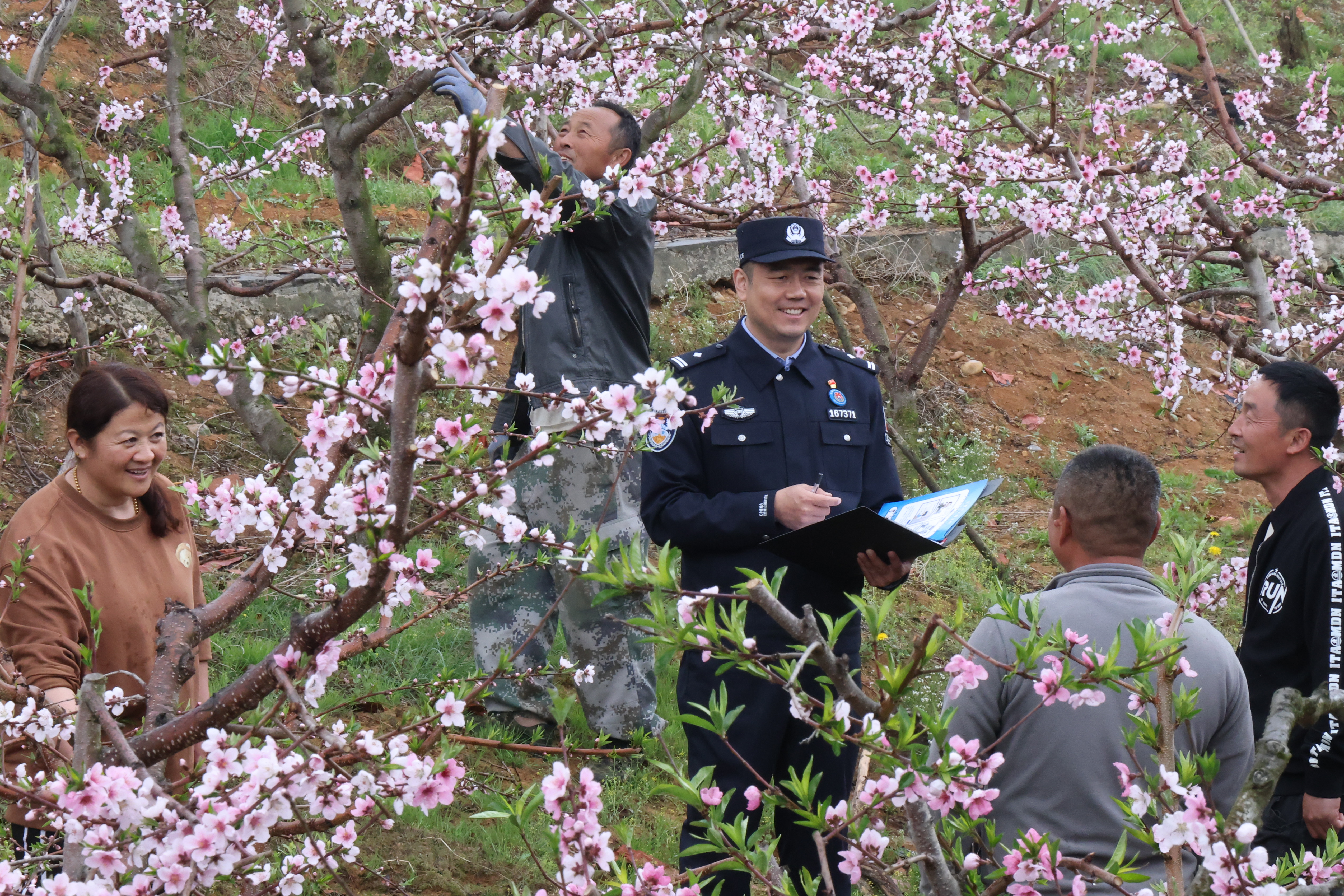 近日,遼寧出入境邊防檢查總站丹東邊境管理支隊(duì)大江口邊境派出所民警深入轄區(qū)桃花園,為桃農(nóng)開展反詐宣傳,守好群眾“錢袋子”。圖為民警走訪村民普及反詐常識。 本報通訊員 郝洪偉 攝