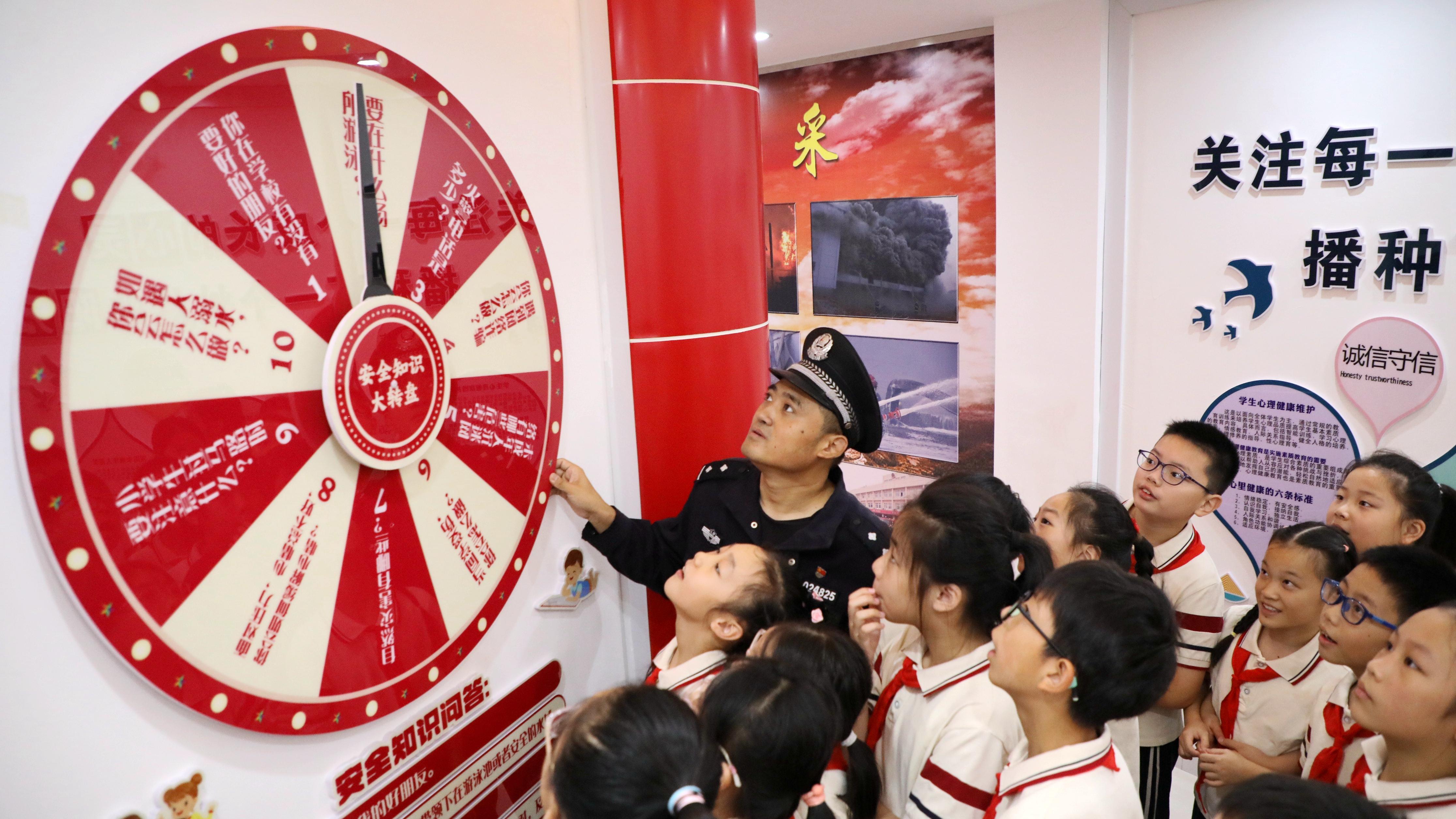 近日,江西省九江市公安局潯陽分局人民路派出所民警來到轄區(qū)湖濱小學(xué),開展主題為“如何保護自身安全,預(yù)防意外事件發(fā)生”安全教育進校園活動。圖為民警用安全知識大轉(zhuǎn)盤向?qū)W生講解安全知識。通訊員 游建棟 攝