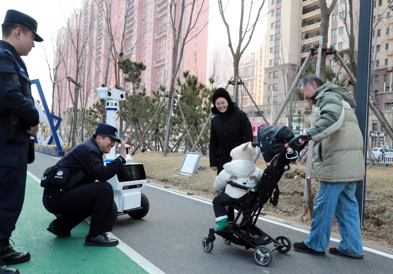 近日,位于山東省煙臺市高新技術產(chǎn)業(yè)開發(fā)區(qū)的科教基地警務站正式啟用,警務站融合了派出所、特巡警等多警種力量,配置無人機、巡邏機器人、多功能自助服務一體機等,24小時全天候開展治安管控和便民服務。圖為警務站民輔警和巡邏機器人共同巡邏時,與轄區(qū)群眾互動。