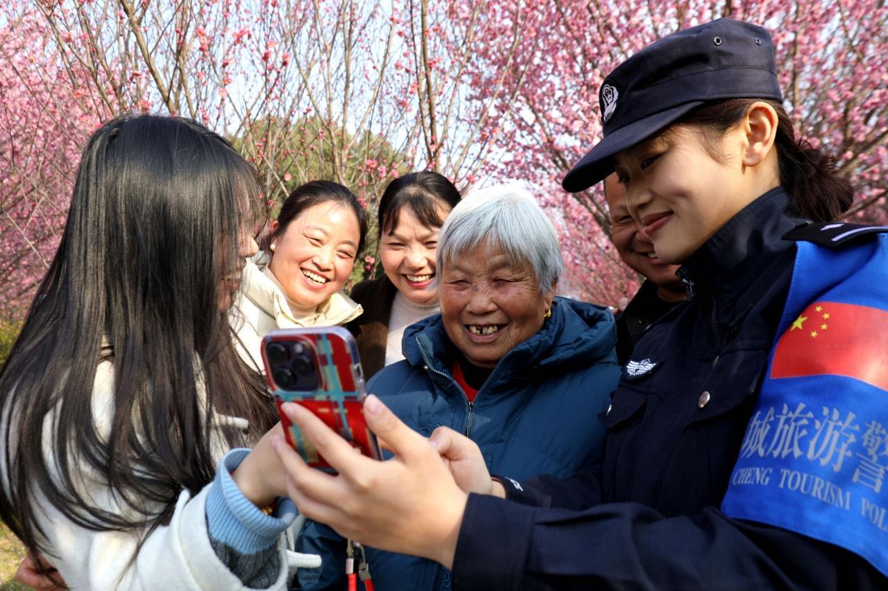 近日,安徽省舒城縣九一六茶園梅花綻放,春意盎然,成為眾多游客的賞花“打卡地”。舒城縣公安局舒茶派出所組織民輔警及時走進景區(qū),開展巡邏守護、服務群眾。圖為民警展示為群眾拍攝的合影。
