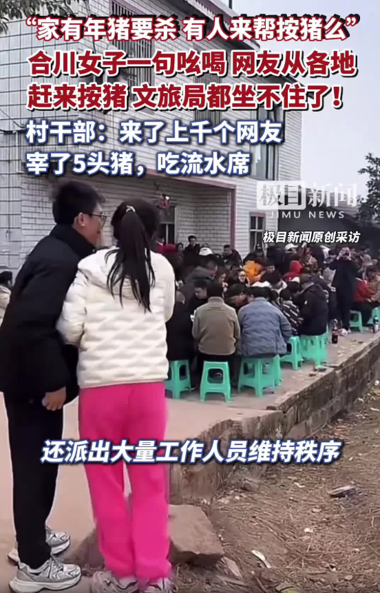 1月9日凌晨,來自重慶合川的抖音博主“呆呆”發(fā)視頻稱,1月11日家中要殺兩頭豬,因為父母年齡大了按不住,希望有人幫忙按豬,將請吃刨豬湯答謝,“呆呆”還開玩笑稱“就想家門口停滿車,在村里揚眉吐氣一回”。短短兩日,視頻點贊量突破18萬,轉發(fā)量超14萬,“呆呆”建立的6個500人的“刨豬湯”群很快滿員。盡管“呆呆”連夜采購食材并報備派出所,但已無法阻止網民熱情。1月10日凌晨,合川文旅緊急抽調工作人員趕赴現場,協助保障活動順利進行。1月11日,來自全國各地超4000名網民匯聚“呆呆”家鄉(xiāng),其中不乏“鹵鵝哥”等知名網紅。1月11日至12日,“呆呆”連開多場直播,邀請網民參加家鄉(xiāng)大聯歡,直播間觀看和點贊人數均超3000萬人次。在合川文旅、愛心企業(yè)、網民等多方贊助下,原計劃的兩頭豬增至五頭,現場設五個分會場分散人流,公安部門疏導交通。合川文旅部門帶著本地特產、景區(qū)門票到現場,講解“刨豬宴”和合川歷史文化,還設置篝火、煙花、舞龍等環(huán)節(jié)。據現場網民透露,當地一共擺了300桌宴席,最多時同時有超3000人。該事件引發(fā)熱烈討論,“殺豬女孩呆呆一天漲粉150萬”“呆呆殺豬宴一天蒸1000多斤大米”等多個話題沖上社交平臺熱搜。