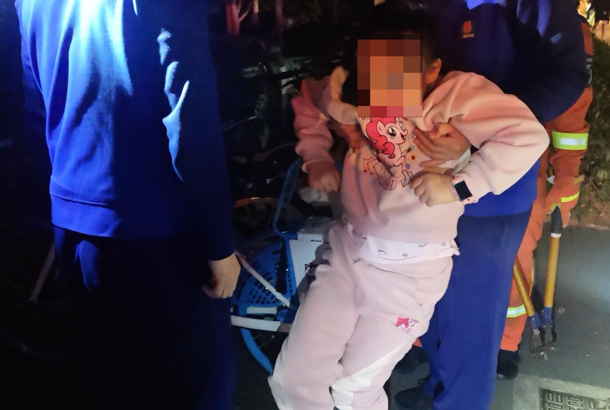 張逸表示:“到場之后我們一看,小孩因為腿部坐到共享單車后面那個座椅里被卡了,腿容易進去,但是不好出來。我們一開始嘗試盡量在不破壞座椅的情況下,把小孩弄出來,后來嘗試無果,我們就對車子進行破拆,對破拆的部位進行了一些保護,怕破拆之后,金屬把小孩劃傷了?!?/p>