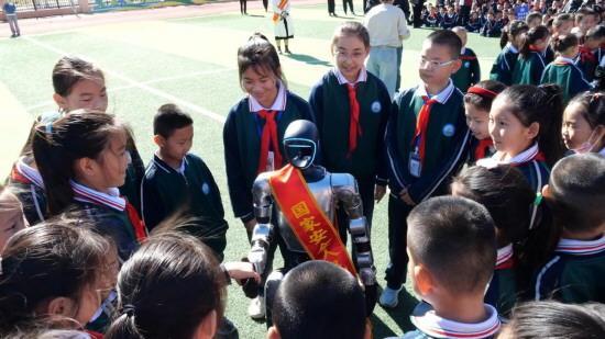 圖為可克達(dá)拉市第一小學(xué)學(xué)生與機(jī)器人互動。 本報通訊員 許磊 攝
