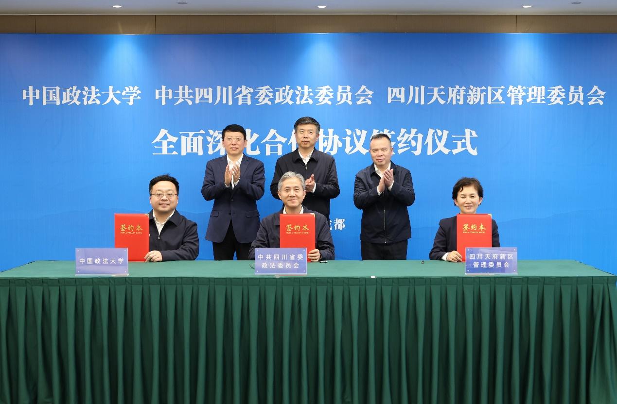 簽署《中共四川省委政法委員會(huì) 四川天府新區(qū)管理委員會(huì) 中國(guó)政法大學(xué)全面深化合作協(xié)議》。
