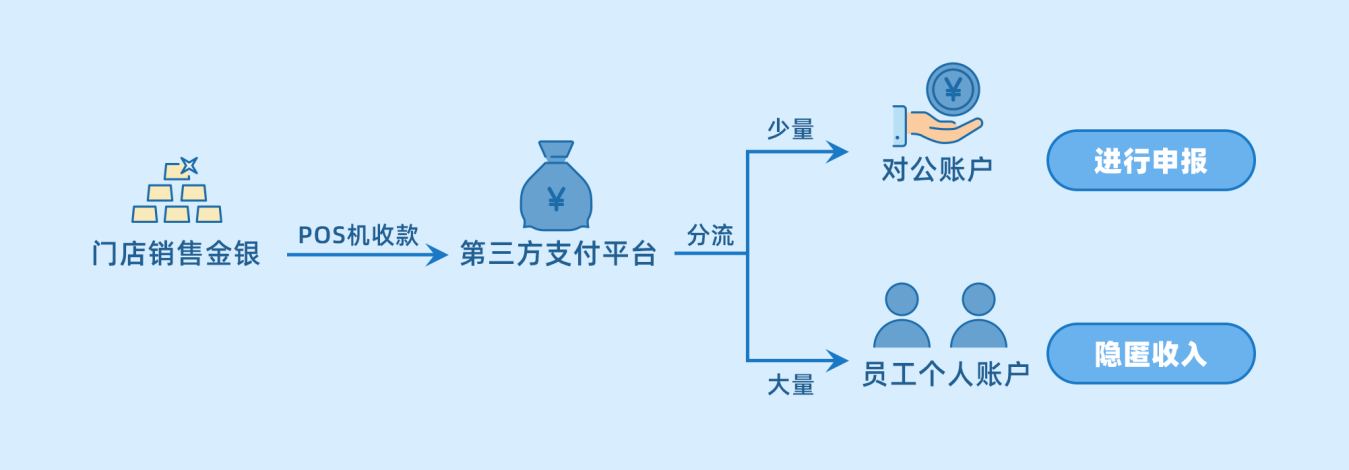 經(jīng)查實(shí),兩家公司共在第三方支付平臺上登記了3個商戶號,除對公賬戶有收款外,另外兩個商戶號均為墾泰商貿(mào)兩家成都分公司的員工的個人賬戶,收款金額較對公賬戶更為巨大。檢查人員隨即依法約談了兩名員工,兩人均承認(rèn)賬戶收款資金實(shí)際為公司銷售金銀飾品取得的銷售貨款。