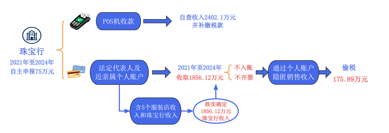 很快,富晨珠寶行自查調(diào)增2021-2024年?duì)I業(yè)收入至2402.1萬(wàn)元,并補(bǔ)繳了稅費(fèi)款,而且其提供的佐證資料中,店內(nèi)POS機(jī)收款金額與自查后的2402.1萬(wàn)元收入相對(duì)應(yīng),表面上雖已賬實(shí)相符,但對(duì)比同地段、同規(guī)模的其他珠寶行,其自查后年均申報(bào)收入仍然偏低。對(duì)此,阿克蘇地區(qū)稅務(wù)局稽查局決定對(duì)其立案檢查。