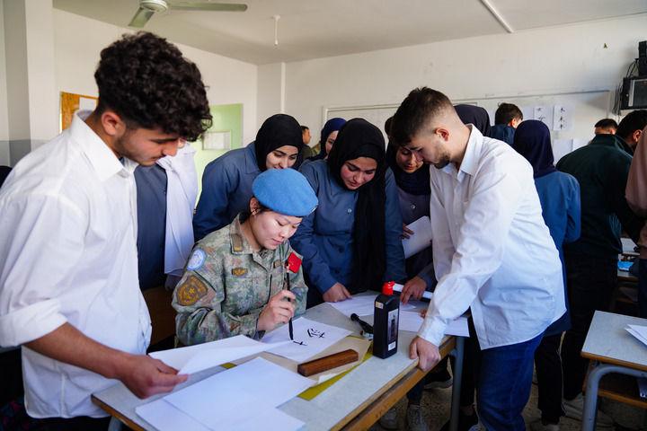 2023年4月3日,中國赴黎巴嫩維和多功能工兵分隊維和女兵韋薇在貝魯特拉赫曼·尤努斯中學(xué)用中文書寫學(xué)生名字。新華社發(fā)(李竹林?jǐn)z)