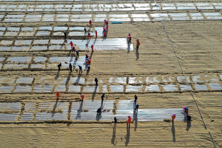 在新疆和田地區(qū)于田縣沙產(chǎn)業(yè)實驗基地,當?shù)厝罕娫诜N植薏米(2025年4月8日攝,無人機照片)。新華社記者 丁磊 攝