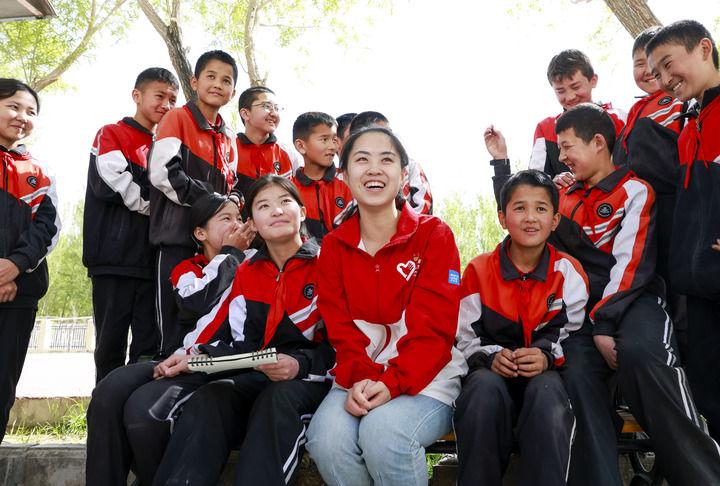 在新疆阿圖什市哈拉峻鄉(xiāng)謝依特小學,支教教師高淑賢和學生們在一起(2025年4月23日攝)。新華社記者 王菲 攝