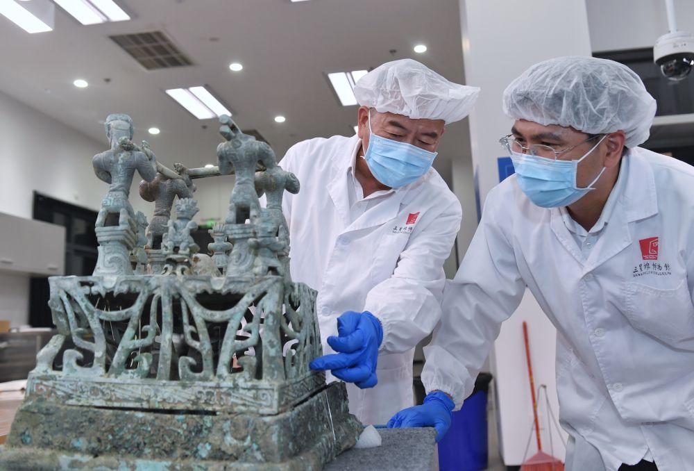 2023年5月30日,在四川三星堆博物館文物保護(hù)和修復(fù)中心,文物修復(fù)師郭漢中(左)與同事討論神壇底座修復(fù)方案。郭漢中從事文物修復(fù)工作已40余年,深度參與了三星堆祭祀坑的發(fā)掘工作,累計(jì)修復(fù)文物6000余件?!按蟾胚€有上萬(wàn)件文物等著修復(fù),需要一代接著一代往下干。”郭漢中說(shuō),他要把平生所學(xué)傳承下去,培養(yǎng)更多人才。