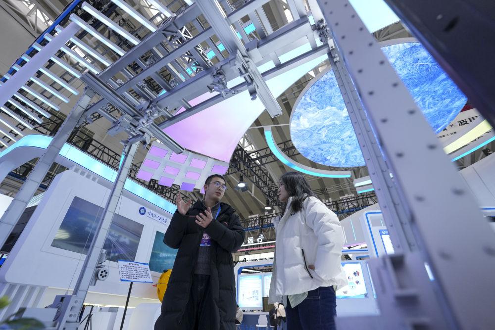2026年1月6日,在2026哈爾濱國(guó)際冰雪經(jīng)濟(jì)博覽會(huì)展會(huì)現(xiàn)場(chǎng),參觀者咨詢一款碳纖維滑雪板性能。
