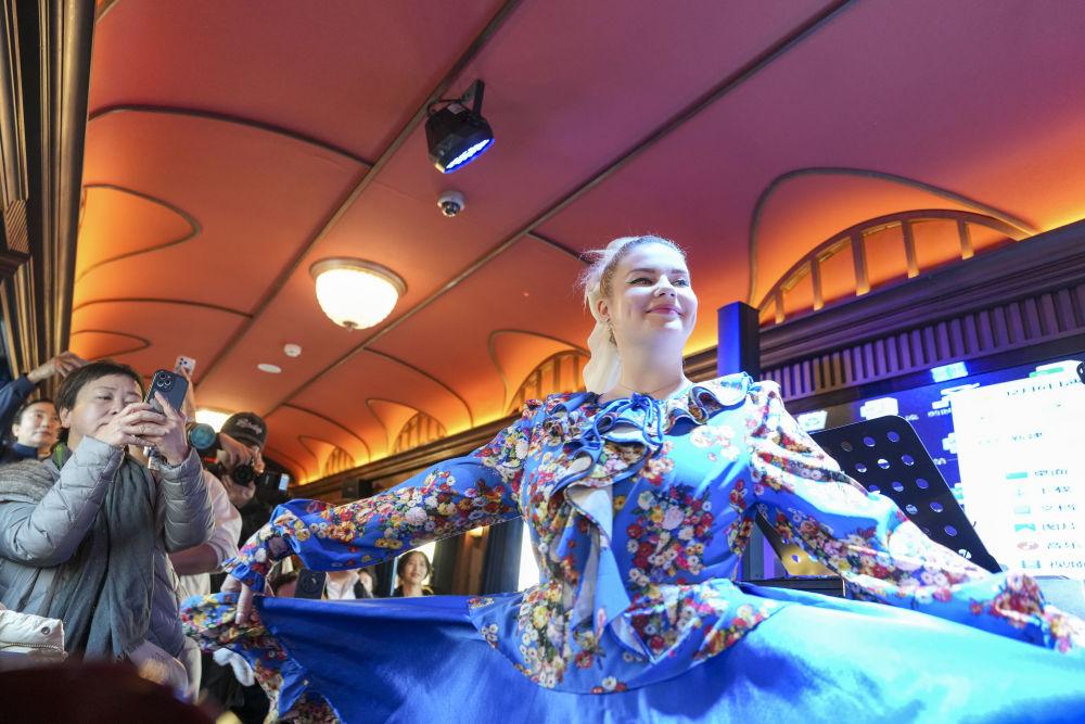 2025年12月6日,演員在黑龍江省“伊春號(hào)”旅游專列車(chē)廂中表演。當(dāng)日,“伊春號(hào)”旅游專列投入試運(yùn)行,40余名受邀體驗(yàn)的游客乘專列由哈爾濱站出發(fā),去往亞布力滑雪旅游度假區(qū)。2025年以來(lái),中國(guó)鐵路哈爾濱局集團(tuán)有限公司陸續(xù)開(kāi)行了多趟旅游列車(chē),將特色體驗(yàn)、民俗展示、定制化服務(wù)等進(jìn)行融合,滿足游客需求,服務(wù)旅客出行。