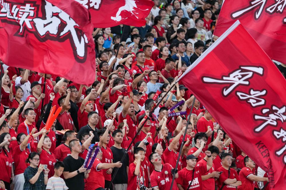 2025年7月20日,2025江蘇省城市足球聯(lián)賽第七輪比賽中,常州隊球迷在場邊加油。新華社記者 李博 攝