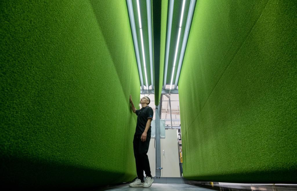 在山東省樂陵市泰山體育產(chǎn)業(yè)集團人造草坪智能化生產(chǎn)車間,工人在檢測產(chǎn)品。新華社記者 范長國 攝