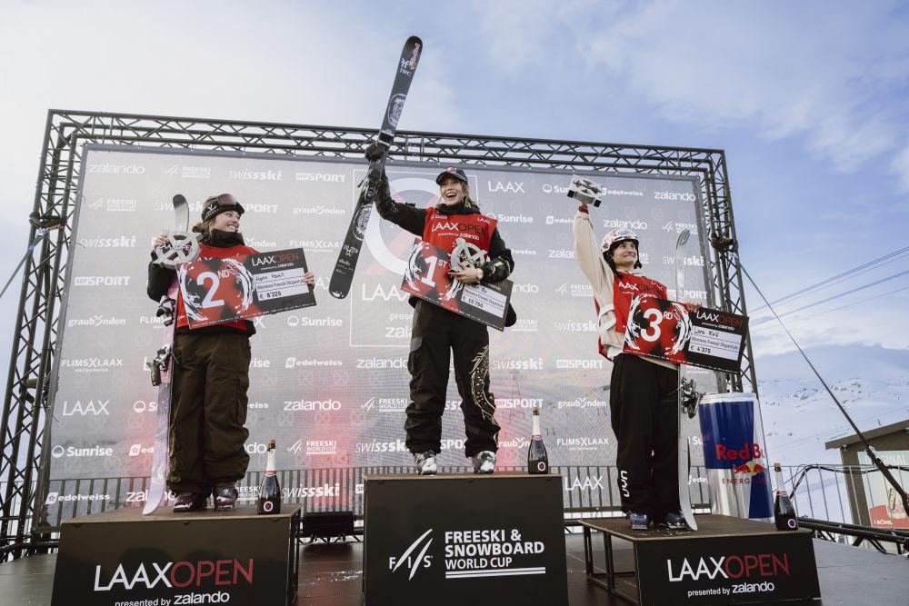 2026年1月17日,在瑞士萊克斯舉行的國際雪聯(lián)世界杯系列賽中獲得女子自由式滑雪坡面障礙技巧冠軍的谷愛凌(中)在領(lǐng)獎(jiǎng)臺(tái)上。新華社發(fā)(馬塞爾·萊默希特?cái)z)