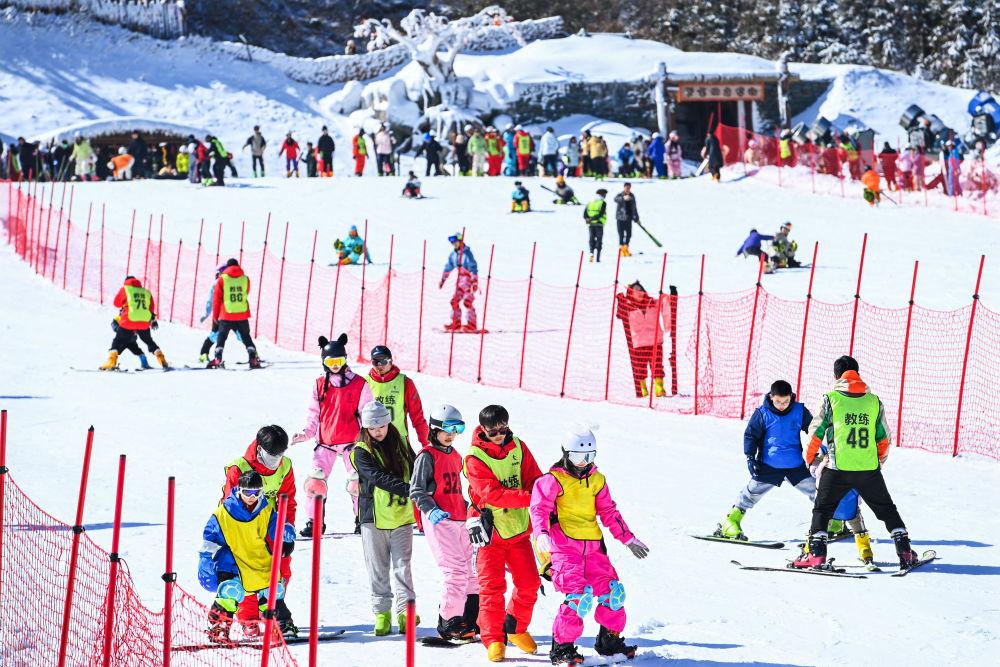 2026年2月2日,在江西省宜春市銅鼓縣排埠鎮(zhèn)七星嶺滑雪場(chǎng),參加冰雪冬令營的學(xué)生在教練的帶領(lǐng)下體驗(yàn)冰雪運(yùn)動(dòng)。新華社發(fā)(周亮攝)