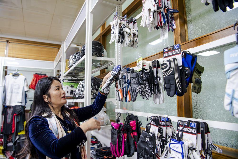 2026年1月6日,這是在廈門博特運(yùn)動(dòng)器材有限公司產(chǎn)品展示間,總經(jīng)理葉小玲在介紹公司生產(chǎn)的冰球手套。新華社記者魏培全攝