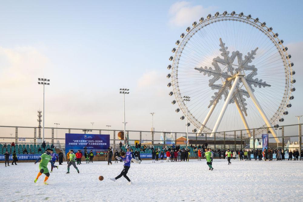 2025年12月20日,參賽球員們?cè)诠枮I市“冰超”系列冰雪賽事啟動(dòng)儀式暨“冰雪大世界杯”2025-2026年冰城首屆“冰雪綠茵”大眾雪地足球挑戰(zhàn)賽中。新華社記者張濤攝