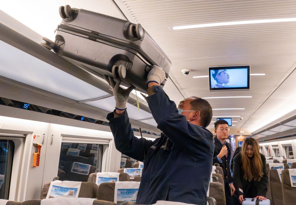 2026年2月2日,在湖北武漢漢口火車站,中鐵快運(yùn)服務(wù)人員在列車到站后拿取乘客的行李。今年春運(yùn),已購車票的旅客可以在鐵路12306App、微信小程序上預(yù)約“輕裝行”服務(wù),有效減輕攜帶大件行李出行的負(fù)擔(dān)。該服務(wù)自2025年6月開始施行,目前試點(diǎn)覆蓋30座車站。