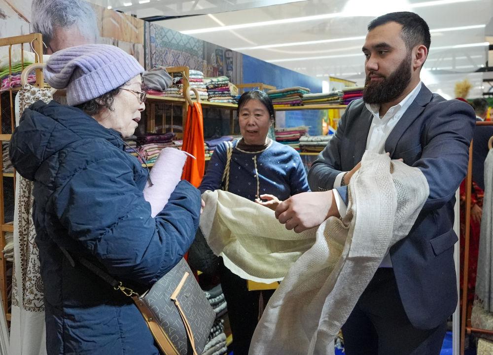 2026年2月4日,在“共享大市場·出口中國”2026年首場活動(dòng)暨北京國際精品薈的進(jìn)口商品推介區(qū),參觀者(左)購買展出的烏茲別克斯坦圍巾。當(dāng)日,“共享大市場·出口中國”2026年首場活動(dòng)暨北京國際精品薈啟動(dòng)活動(dòng)在灣里·王府井WellTown舉行,現(xiàn)場打造了“一站式”全球好物采購展區(qū),為市民新春消費(fèi)注入活力。