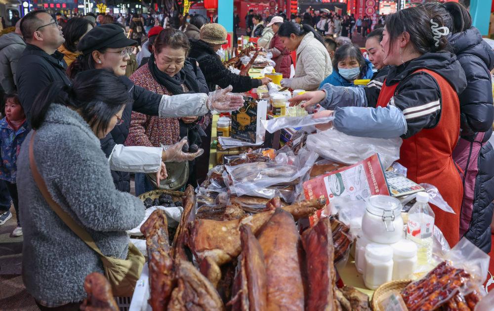 2026年2月1日,在重慶市兩江新區(qū)觀音橋步行街,市民在現(xiàn)場選購巴渝“土特產(chǎn)”。當(dāng)日,巴渝“土特產(chǎn)”名優(yōu)百品年貨季在重慶啟幕。本次年貨季吸引近百家經(jīng)營主體參展,集中展示重慶各地優(yōu)質(zhì)土特產(chǎn)。