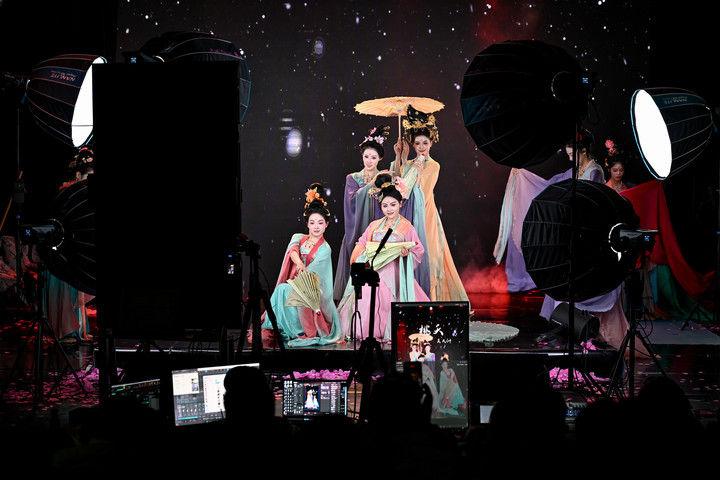 陜西省歌舞劇院的舞蹈演員在直播間進(jìn)行“團(tuán)播”表演(2025年12月25日攝)?!皥F(tuán)播”這一多人演藝直播新形式,正成為專業(yè)文藝院團(tuán)開辟線上“第二舞臺”、推動傳統(tǒng)文化創(chuàng)新表達(dá)的新嘗試。“豎屏化”“快節(jié)奏”的改編,讓傳統(tǒng)劇目受到越來越多年輕人喜愛。數(shù)據(jù)顯示,陜西省歌舞劇院“團(tuán)播”單場最高曝光量超500萬,帶動線下票房增長約10%。