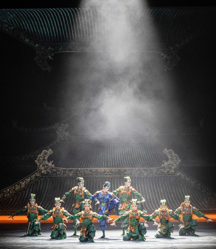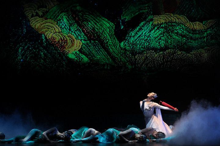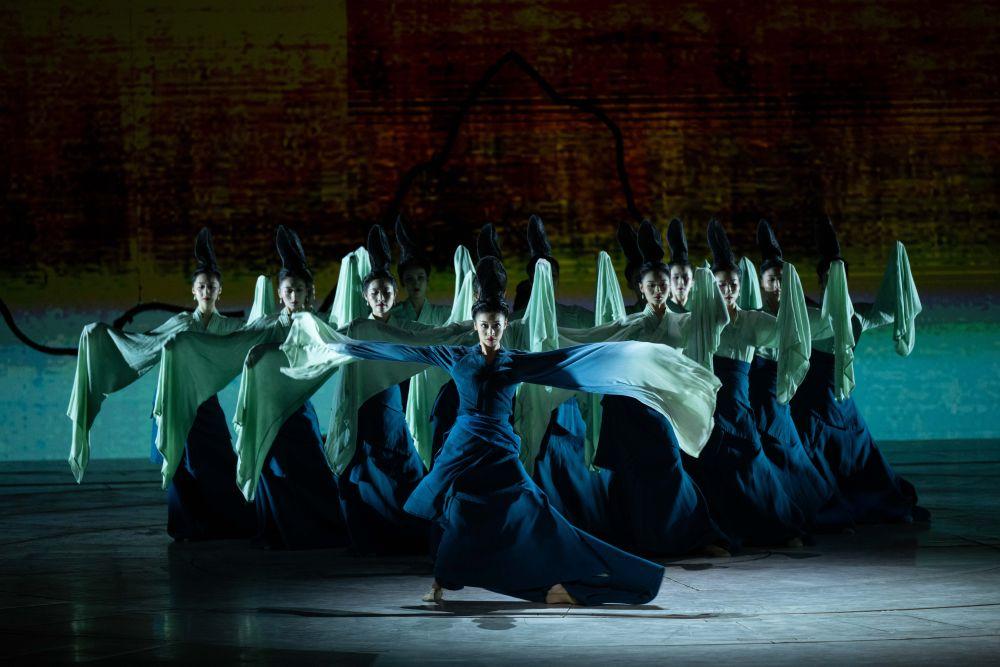 這是舞蹈詩劇《只此青綠》的演出劇照(2024年7月18日攝)。《只此青綠》采用平行空間的敘事方式,從故宮博物院青年研究員的“展卷人”視角出發(fā),講述北宋著名畫家王希孟創(chuàng)作《千里江山圖》的故事。該劇連續(xù)3年穩(wěn)居中國舞劇票房榜首,全國巡演超800場,赴多個國家和地區(qū)演出50余場,成為傳統(tǒng)文化創(chuàng)新表達(dá)、中國藝術(shù)國際表達(dá)的典范之作。