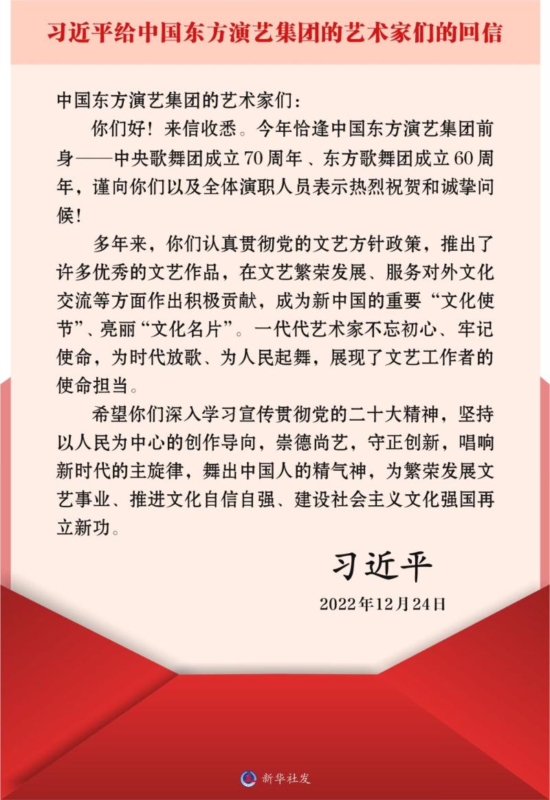 2022年,習(xí)近平總書記給中國東方演藝集團(tuán)的藝術(shù)家們回信,勉勵他們?yōu)榻ㄔO(shè)社會主義文化強(qiáng)國再立新功。