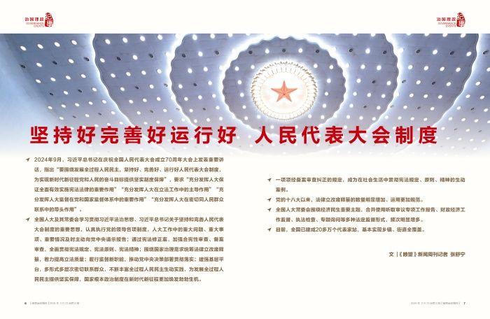 ◇2024年9月,習(xí)近平總書記在慶祝全國(guó)人民代表大會(huì)成立70周年大會(huì)上發(fā)表重要講話,指出“要圍繞發(fā)展全過(guò)程人民民主,堅(jiān)持好、完善好、運(yùn)行好人民代表大會(huì)制度,為實(shí)現(xiàn)新時(shí)代新征程黨和人民的奮斗目標(biāo)提供堅(jiān)實(shí)制度保障”,要求“充分發(fā)揮人大保證全面有效實(shí)施憲法法律的重要作用”“充分發(fā)揮人大在立法工作中的主導(dǎo)作用”“充分發(fā)揮人大監(jiān)督在黨和國(guó)家監(jiān)督體系中的重要作用”“充分發(fā)揮人大在密切同人民群眾聯(lián)系中的帶頭作用”。