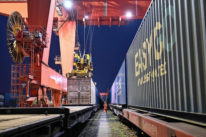 貨運員在成都國際鐵路港檢查吊運的中歐班列集裝箱(2026年2月16日攝)。新華社發(fā)(何海洋 攝)