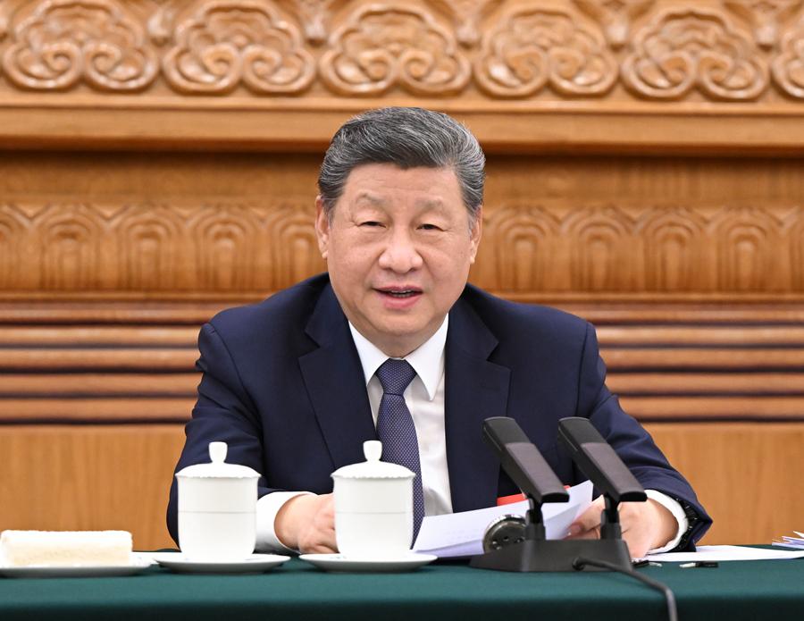 3月5日下午,中共中央總書(shū)記、國(guó)家主席、中央軍委主席習(xí)近平參加他所在的十四屆全國(guó)人大四次會(huì)議江蘇代表團(tuán)審議。新華社發(fā)(盛佳鵬攝)