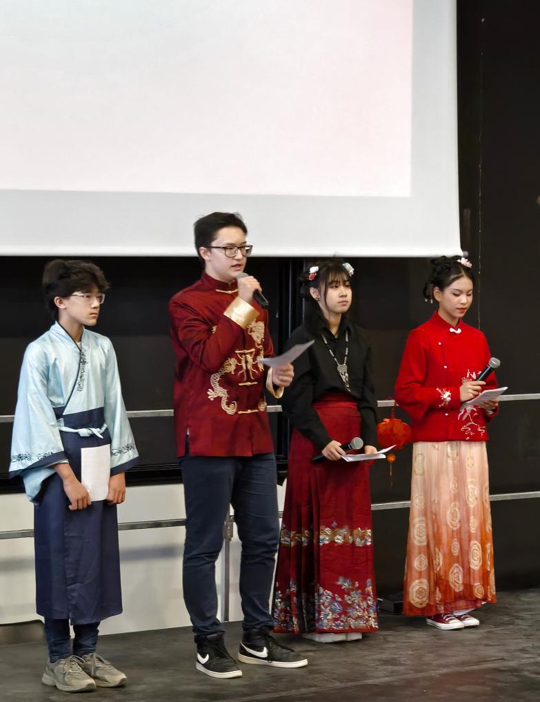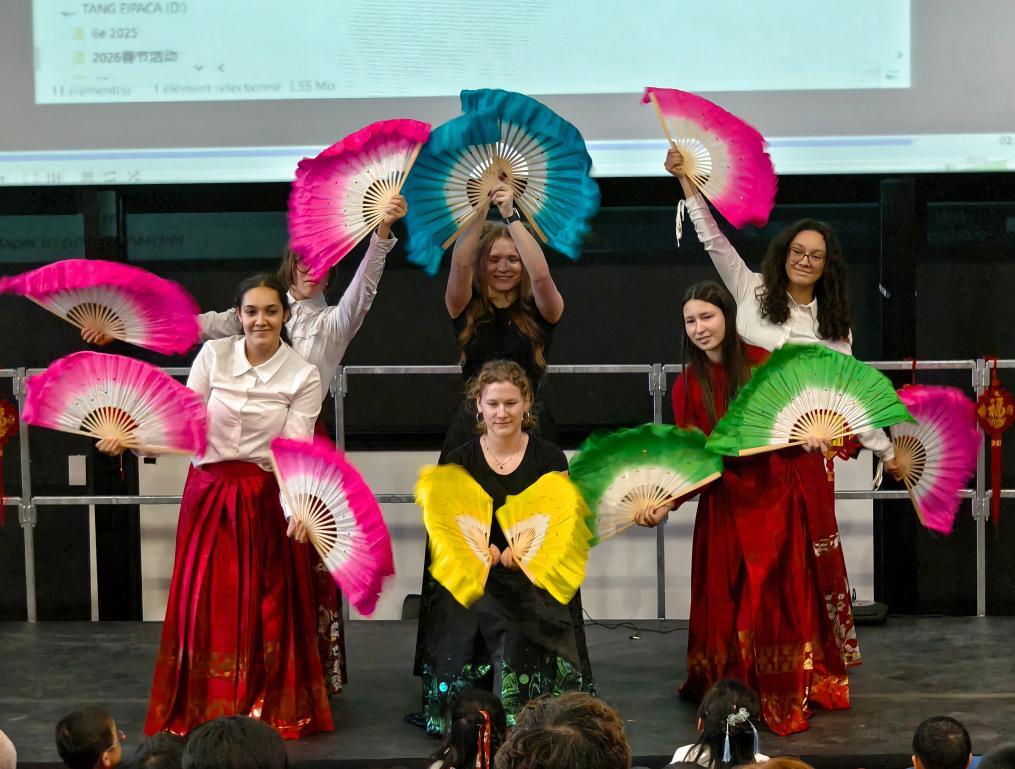 2月5日,在法國(guó)馬諾斯克,普羅旺斯-阿爾卑斯-藍(lán)色海岸大區(qū)國(guó)際學(xué)校學(xué)生在春節(jié)活動(dòng)上表演。新華社發(fā)(普羅旺斯-阿爾卑斯-藍(lán)色海岸大區(qū)國(guó)際學(xué)校供圖)