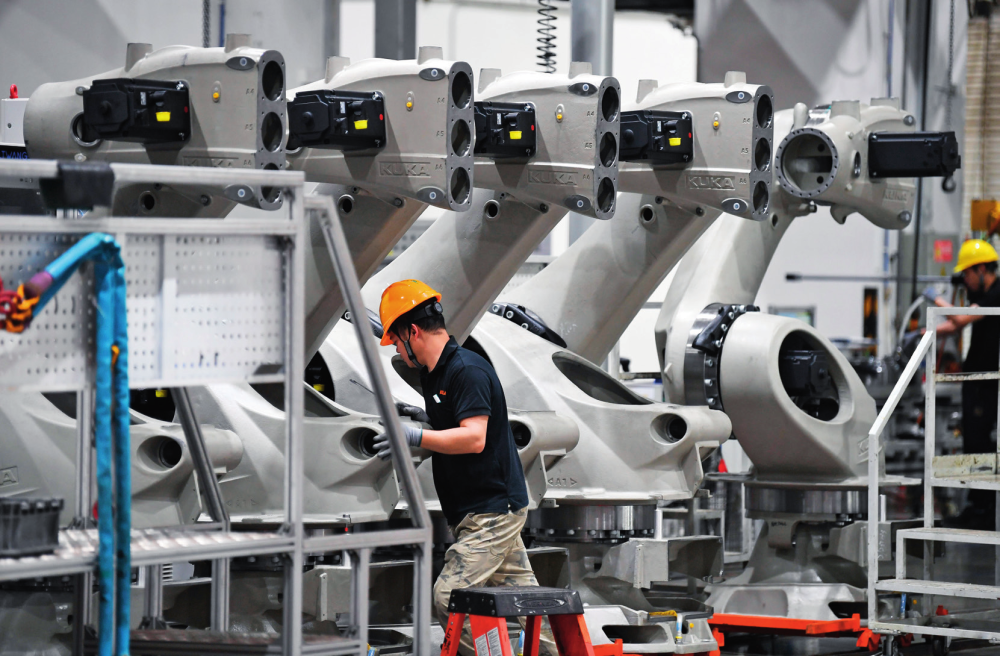 在廣東佛山市美的庫卡智能制造科技園拍攝的工業(yè)機器人產(chǎn)線車間(2025年3月25日攝)。鄧華攝/本刊