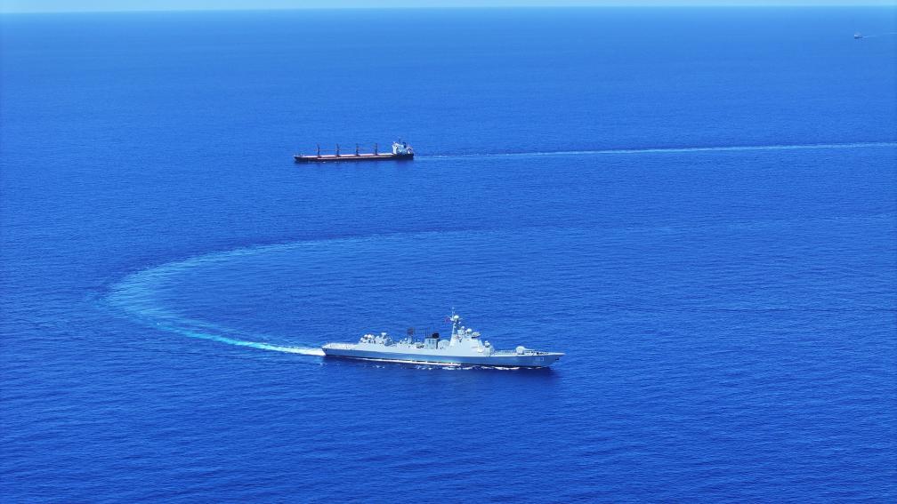 中國海軍第46批護航編隊焦作艦(下)護送貨船至解護點后與之分航(2024年5月7日攝)。新華社發(fā)(張大禹 攝)